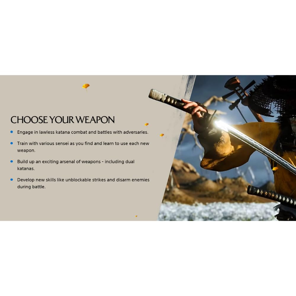 - CHOOSE YOUR WEAPON : With levelled-up dual katanas, ōdachi, kusarigama and other new weapons, there’s no singular way to fight. Build a growing arsenal of weapons worthy of fighting the Yōtei Six.