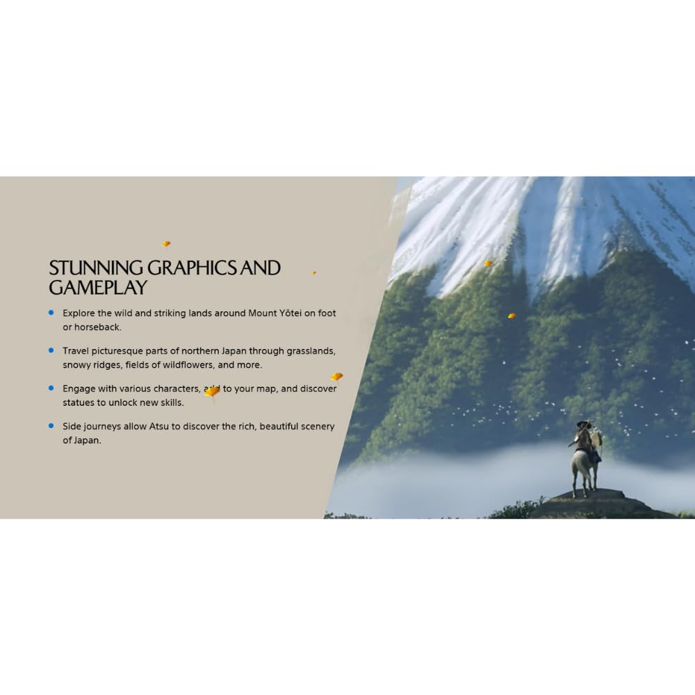 - STUNNING GRAPHICS AND GAMEPLAY Explore the wild and striking lands around Mount Yōtei on foot or horseback. Travel picturesque parts of northern Japan through grasslands, snowy ridges, fields of wild flowers and more. Engage with local settlers, add to your map and discover statues to unlock new skills. Side journeys allow Atsu to discover the rich, beautiful scenery of Japan.